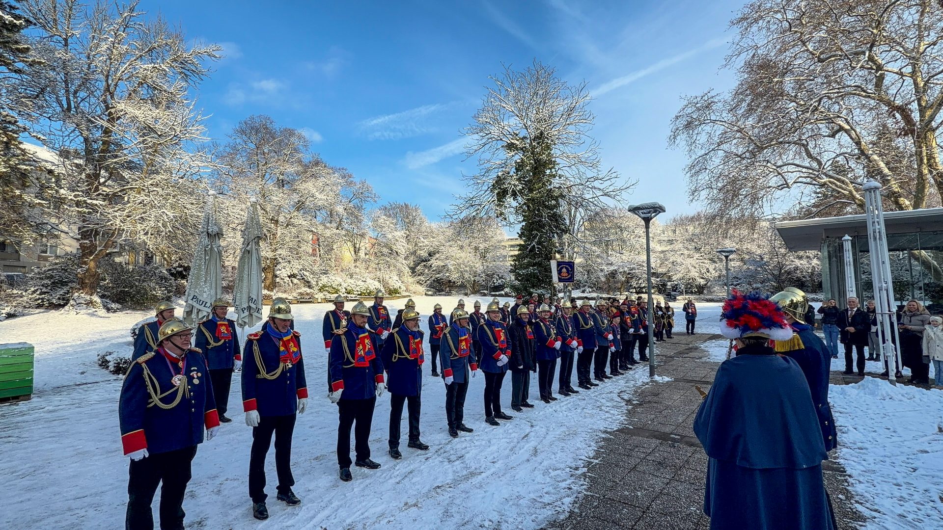 Vor den Parkterrassen nahmen Präsident Adrian Cordewener zusammen mit Tanzmarie Sarah und Zeremonienmeister Heinz-Josef Dohmen die Uniformen der Mannschaft ab. Bis auf zwei Spritzemänner, die den Dienst in Badelatschen antreten wollten, waren die Uniformen makellos und es konnte vermeldet werden, dass wir für die neue Session parat stehen.