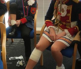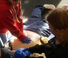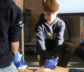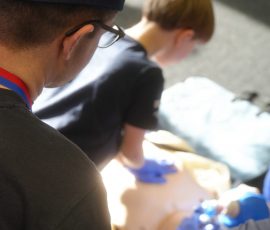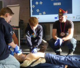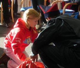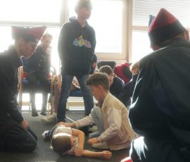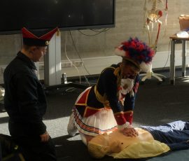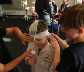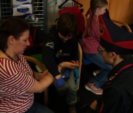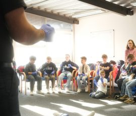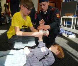 Wo sonst Rettungs- und Notfallsanitäter ausgebildet werden, gab es heute von unserem Präsidenten Adrian einen Einblick in die Erste Hilfe und eine Reanimationsschulung. Nach einer Stärkung mit Puffeln der Bäckerei Moss ging es für die wissenshungrige Gruppe in eine praktische Übung bei der an einer Puppe die Reanimation und am Nebenmann oder der Nebenfrau ein Druckverband trainiert wurde.