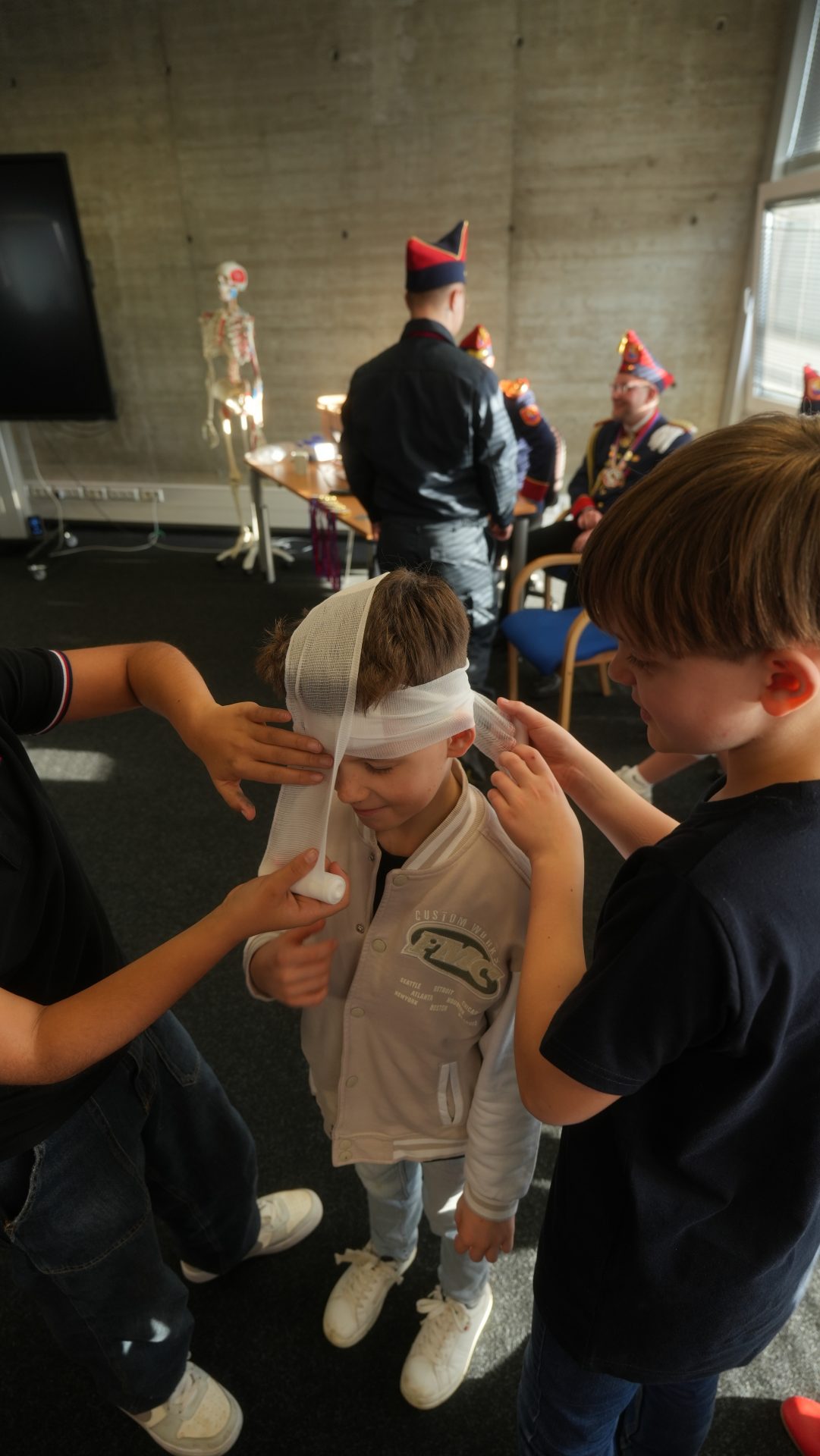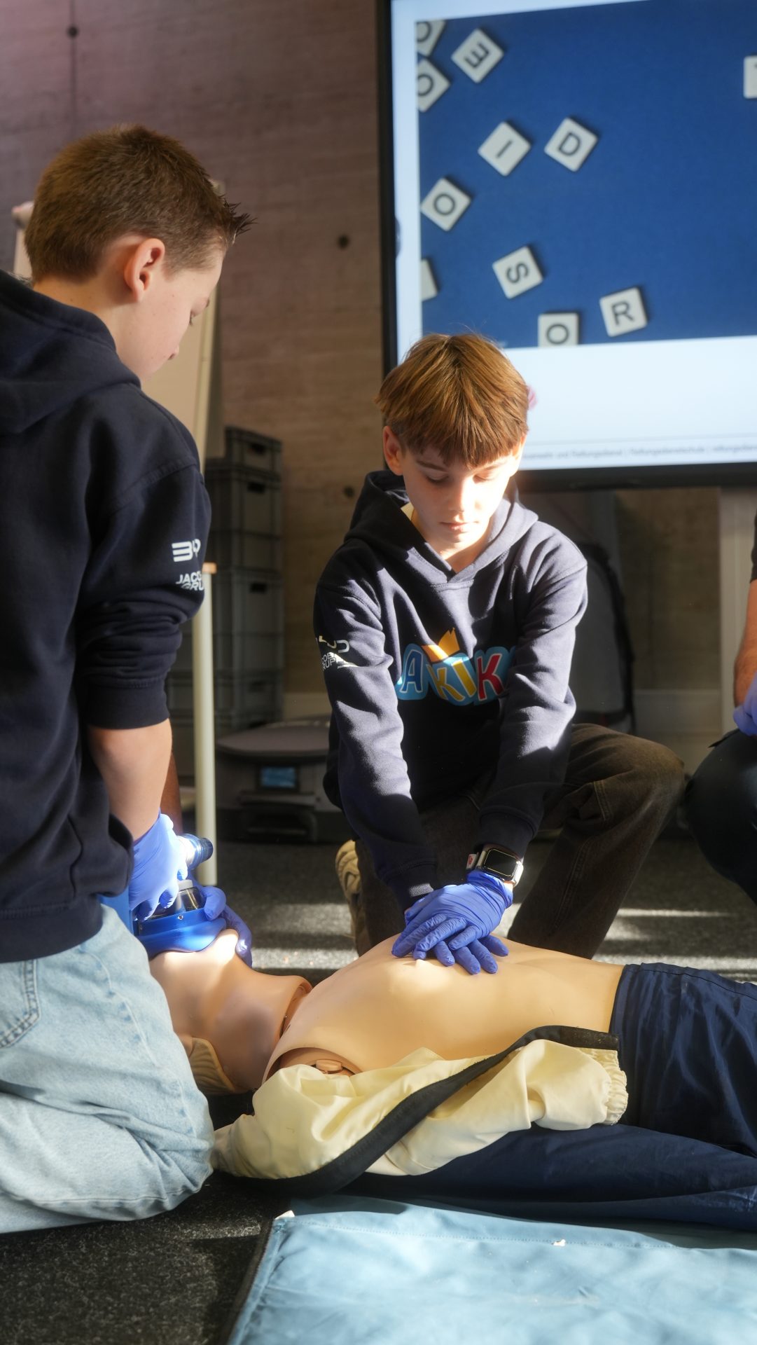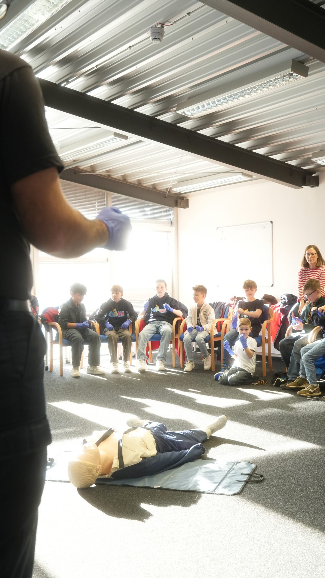 Wo sonst Rettungs- und Notfallsanitäter ausgebildet werden, gab es heute von unserem Präsidenten Adrian einen Einblick in die Erste Hilfe und eine Reanimationsschulung. Nach einer Stärkung mit Puffeln der Bäckerei Moss ging es für die wissenshungrige Gruppe in eine praktische Übung bei der an einer Puppe die Reanimation und am Nebenmann oder der Nebenfrau ein Druckverband trainiert wurde.