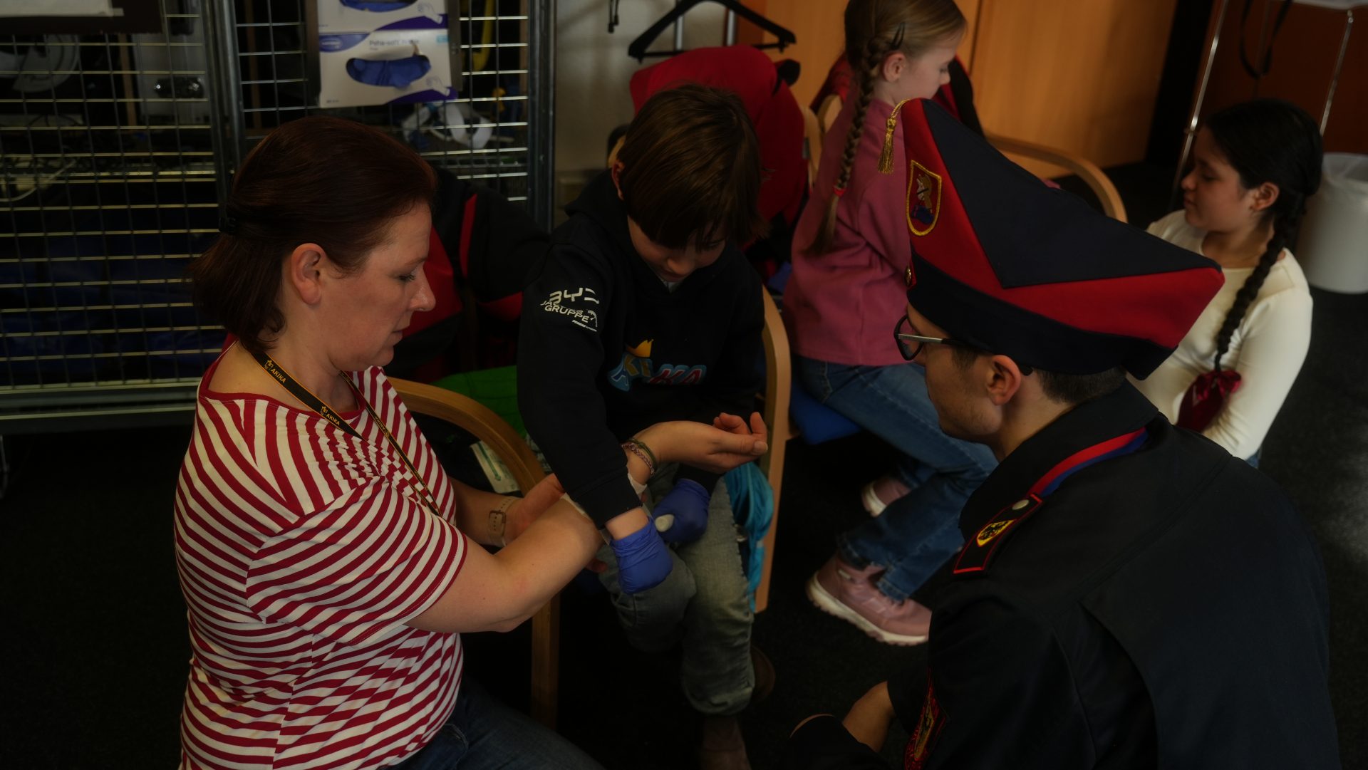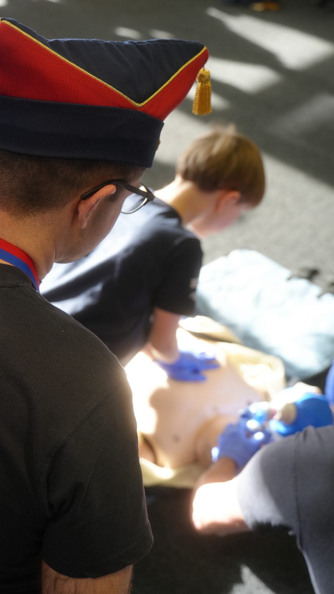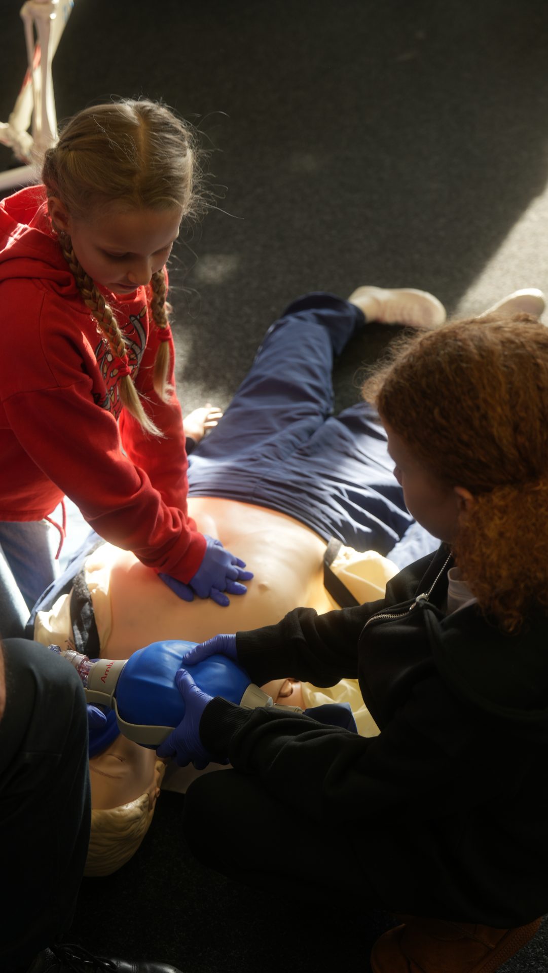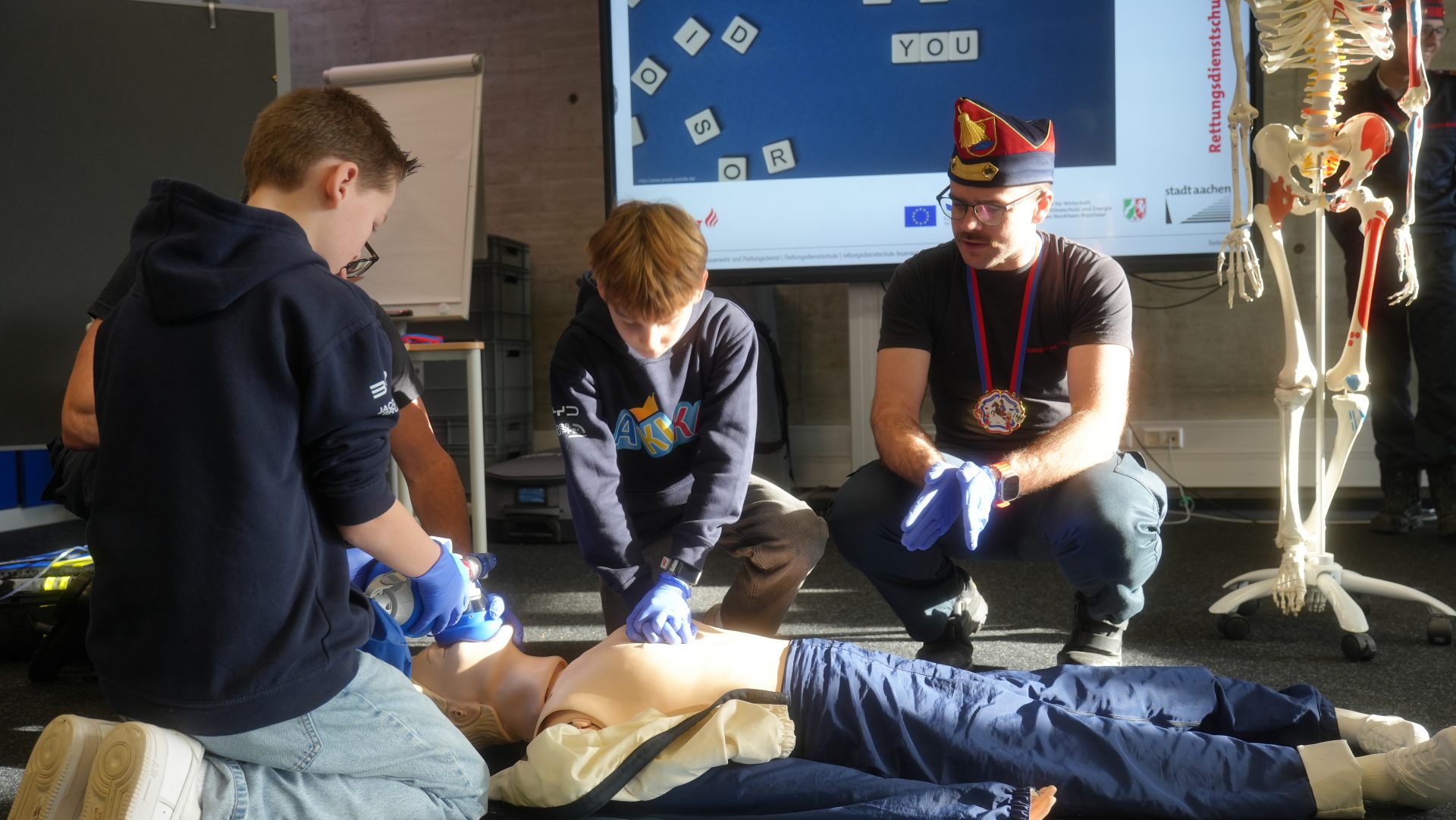 Wo sonst Rettungs- und Notfallsanitäter ausgebildet werden, gab es heute von unserem Präsidenten Adrian einen Einblick in die Erste Hilfe und eine Reanimationsschulung. Nach einer Stärkung mit Puffeln der Bäckerei Moss ging es für die wissenshungrige Gruppe in eine praktische Übung bei der an einer Puppe die Reanimation und am Nebenmann oder der Nebenfrau ein Druckverband trainiert wurde.