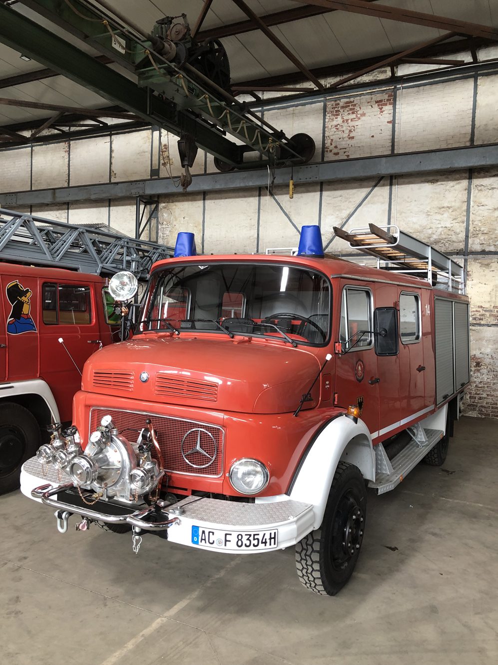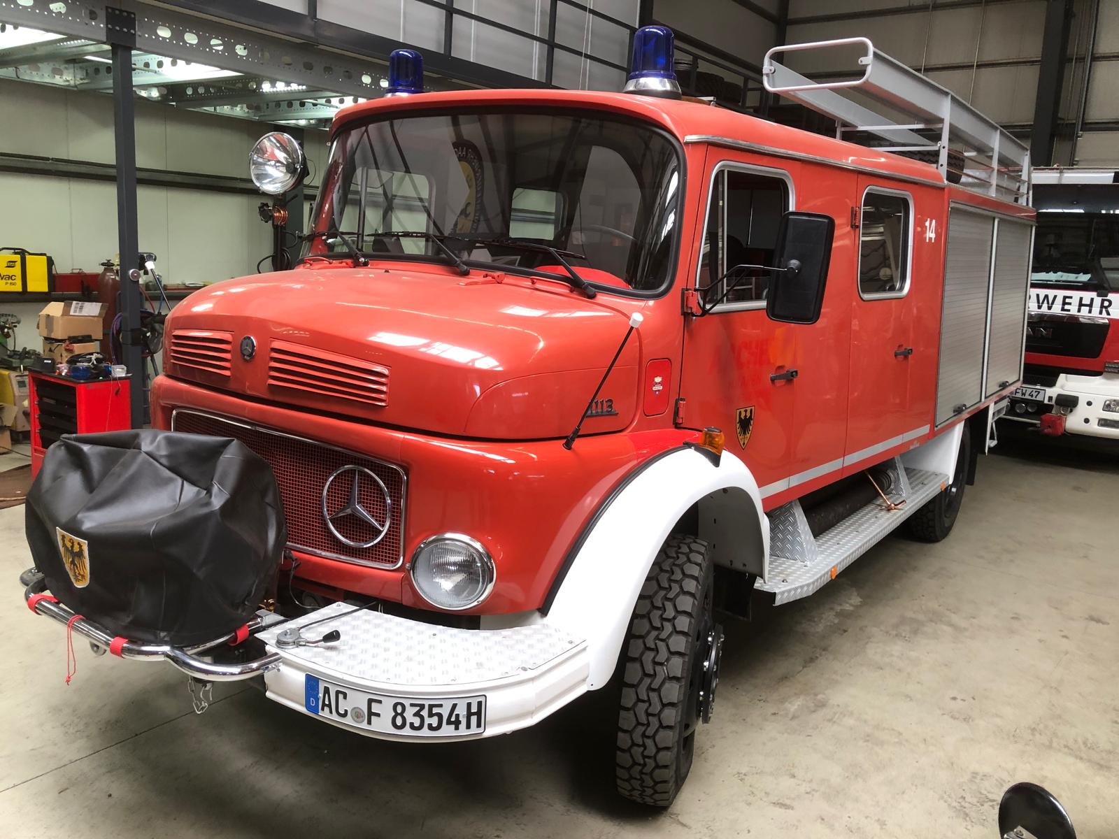Dieses Fahrzeug ist eines von 602 LF 16-TS Fahrzeugen, die vom Bund an-geschafft wurden und 1987 durch die Stadt Aachen beim Löschzug Haaren mit dem Kennzeichen AC – 8354 stationiert wurde. Dort war es bis 2016 im Einsatz und wird zwischenzeitlich bei den Oecher Spritzemännern mit dem H-Kennzeichen AC F 8354 H als Gerätewagen / Logistik verwendet.